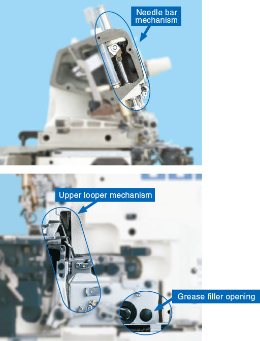 Sólo los componentes más propensos a salpicaduras de aceite (barra de agujas y mecanismos del enlazador superior) cuentan con lubricación seca .