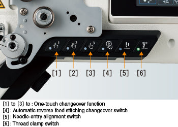 The six-key hand switch lets operators call up pre-set sewing conditions — stitch length, needle-thread tension, alternating lift, presser pressure and speed — without leaving the seam. Initially, keys 4–6 are assigned to automatic reverse feed, needle-entry alignment and thread clamping, so core actions sit directly under the thumb.