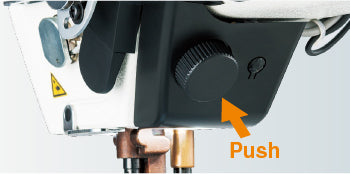 The jog dial turns the main shaft to move the needle up and down without reaching for the handwheel and can be pushed for a 1/2-stitch correction. This gives fine control at corners, notches and other detail points on heavy assemblies.