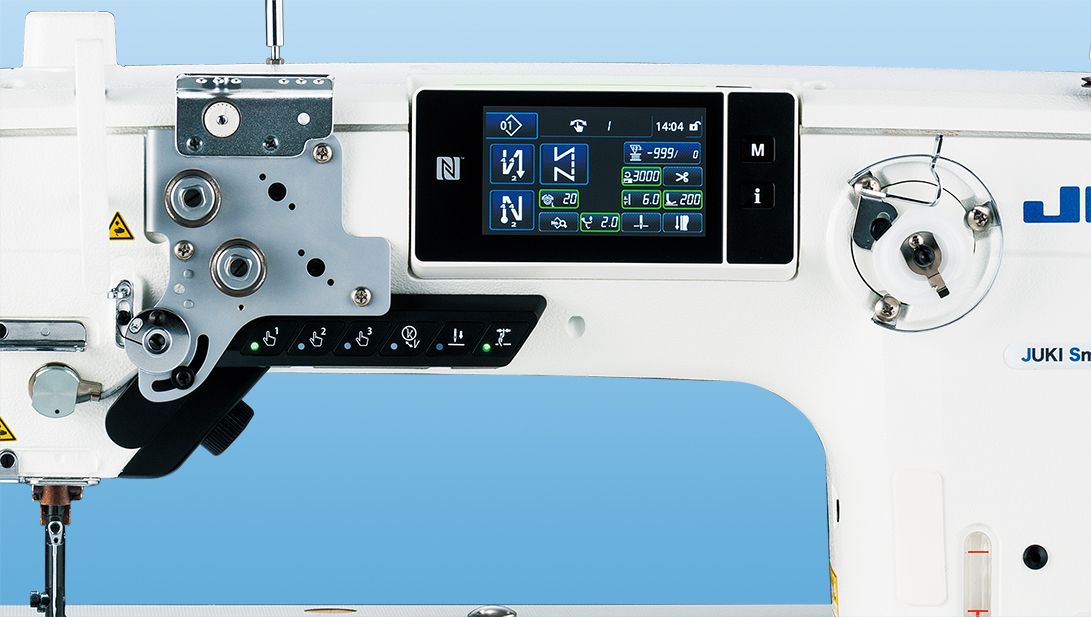 Article-specific settings can be saved, adjusted once and reused, with USB/NFC support helping move those programs between stations. One-touch changeover keys allow section-specific sewing sets within a single seam. -