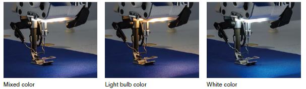 The adjustable LED hand light offers three color tones — daylight, warm, and mixed — providing clear visibility and reducing eye strain during detailed sewing.