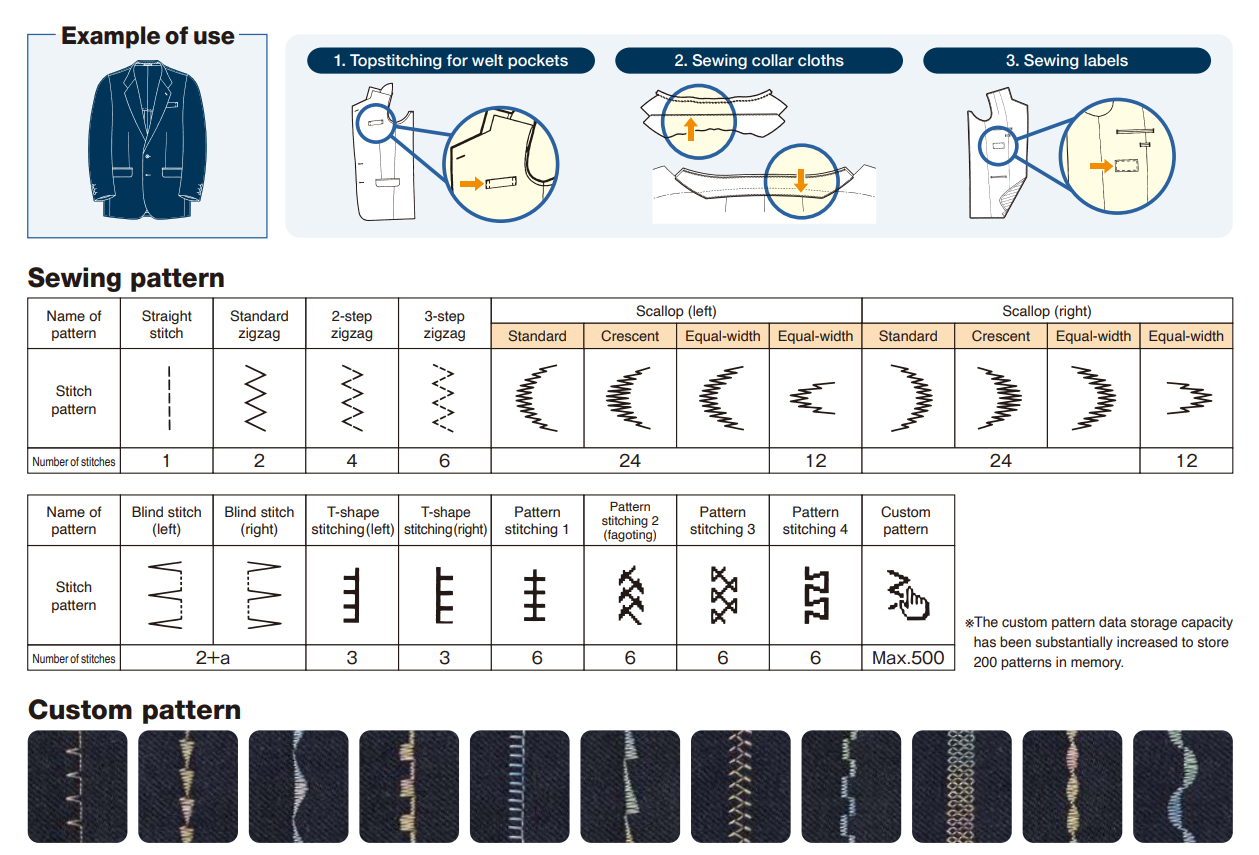 With 11 types / 20 patterns of preset basic stitch shapes — including zigzag, T-stitch, and decorative options — the machine adapts easily to a variety of garment applications. Up to 200 custom stitches can be programmed directly from the panel, supporting both functional and design-driven sewing.