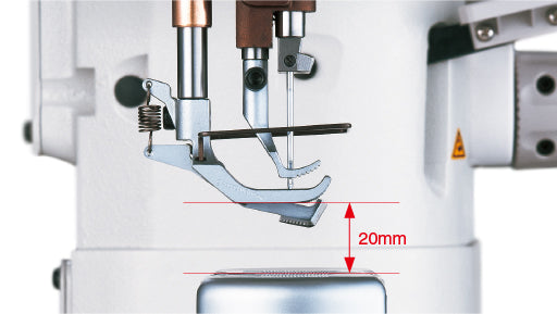 Presser-foot lift 10 mm by hand and up to 20 mm by auto. Dial-adjustable alternating vertical movement 1–9 mm to step cleanly over joins and control foot climb.
