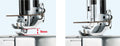 The machine can auto-switch to a pre-registered set of parameters (pitch, tension, pressure, alternating lift) when a thickness change is detected, stabilizing stitch quality over step-ups.