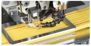 Uses a specialized thermal cutter to trim both upper and lower threads, sealing ends and preventing fraying.