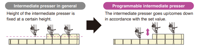 The intermediate presser’s lower-dead-point height can be set per pattern, allowing it to respond smoothly to changes in material thickness. By keeping layers firmly controlled, it minimizes stitch skipping and thread breakage while maintaining crisp, precise pattern edges.